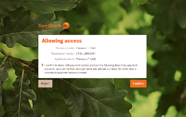 كل الدول تدفق الدفع في Swedbank (PIS API) ستجد هنا تعليمات لعملاء Swedbank حول كيفية الدفع باستخدام خدمة بدء الدفع Paysera (PIS). 1. تسجيل الدخول. بعد تقديم الموافقة، يتم إعادة توجيهك إلى البنك الذي تتعامل معه حيث يتعين عليك تسجيل الدخول. الرجاء تحديد طريقة تسجيل الدخول وإدخال البيانات المطلوبة. × 2. توفير الوصول إلى أرقام الحسابات. بعد تسجيل الدخول، قم بتأكيد الوصول إلى أرقام حسابك الخاصة بالبنك المحدد. × 3. وقع على الدفع. يتم إنشاء دفعة تحتاج فقط إلى تأكيدها. ×